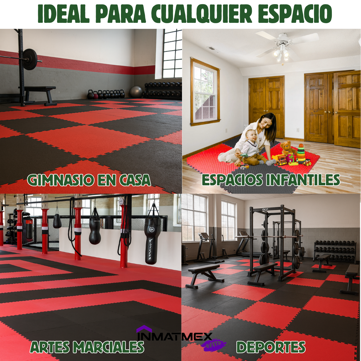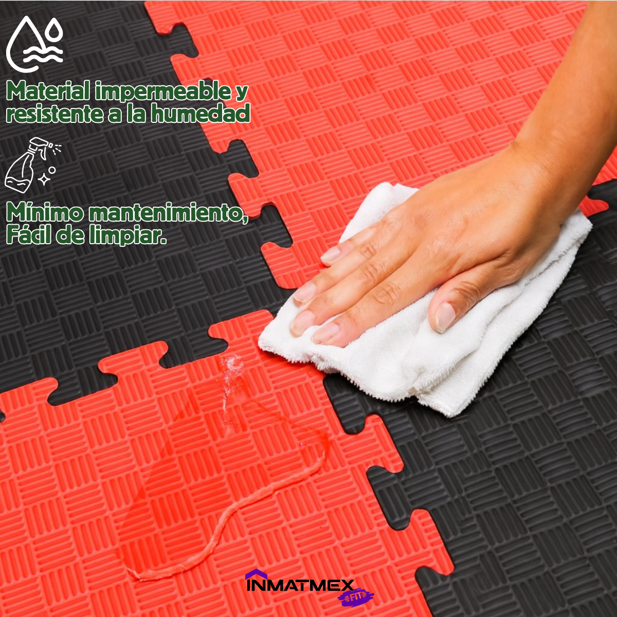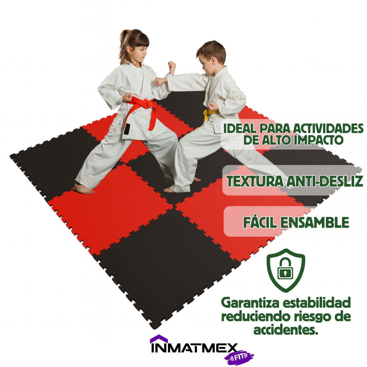 Tatami bicolor de 2 cm de grosor y medidas de 1 m x 1 m, resistente y acolchado. Ideal para artes marciales, gimnasios o áreas de entrenamiento, brinda confort, absorción de impacto y un diseño reversible para mayor versatilidad.